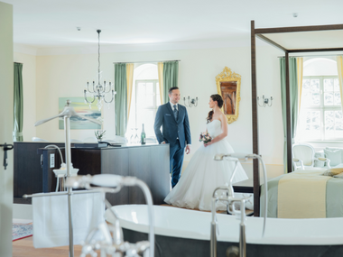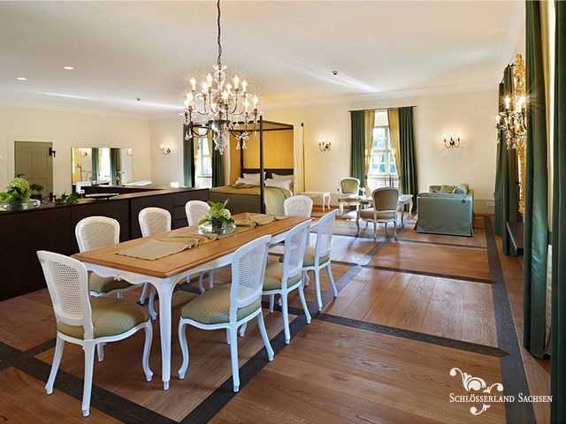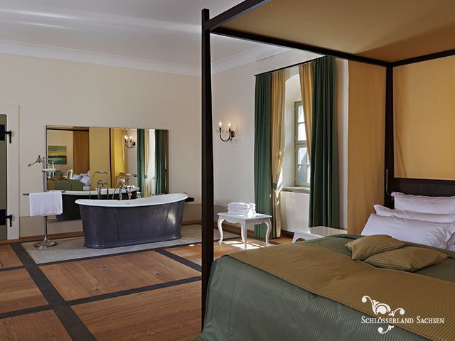 Die Suite befindet sich in einem der Kavaliershäuser. Sie wird gern von oder für Brautpaare gebucht, die sich für die Hochzeitsnacht etwas Einmaliges wünschen.